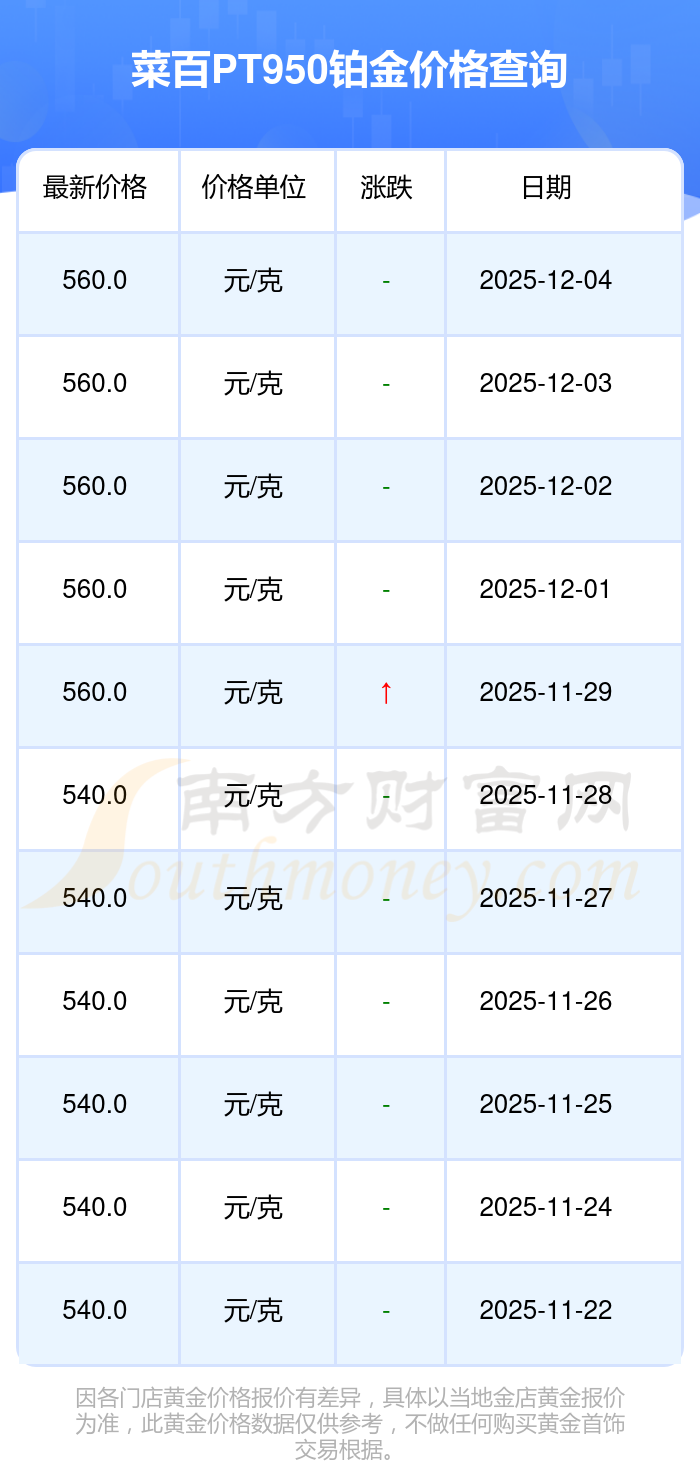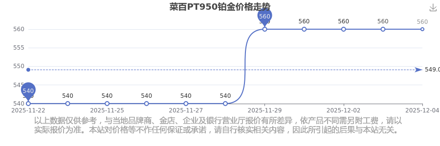 2025年12月4日菜百PT950鉑金價(jià)格最新是560.0元/克。