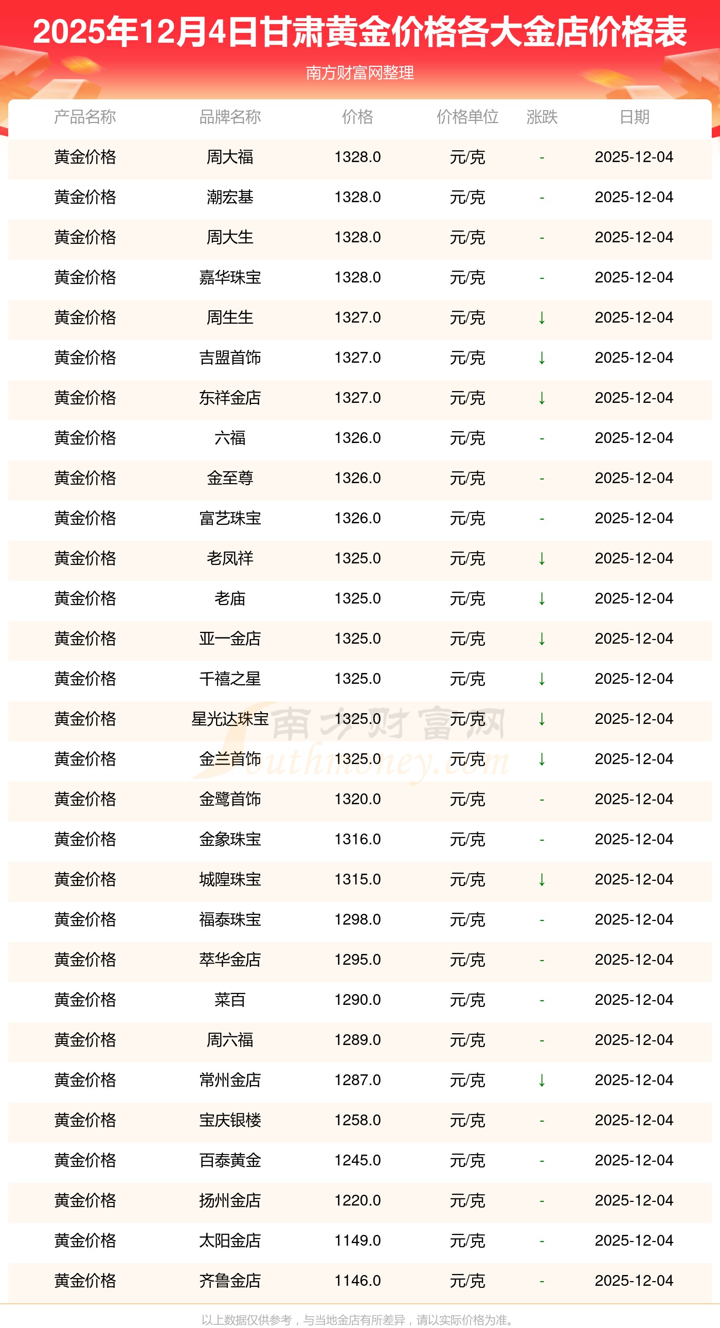 2025年12月4日,甘肅周大福、周大福、周大福、周大福、周大福、周大福、周大福、老鳳祥、老鳳祥、老鳳祥、六福等各大金店品牌黃金價(jià)格今日價(jià)格行情最新來(lái)了:周大福1328.0元/克、周大福671.0元/克、周大福1328.0元/克、周大福46730.0、周大福19260.0、周大福42160.0、周大福1165.0元/克、老鳳祥1325.0元/克、老鳳祥600.0元/克、老鳳祥1325.0元/克、六福1326.0元/克。