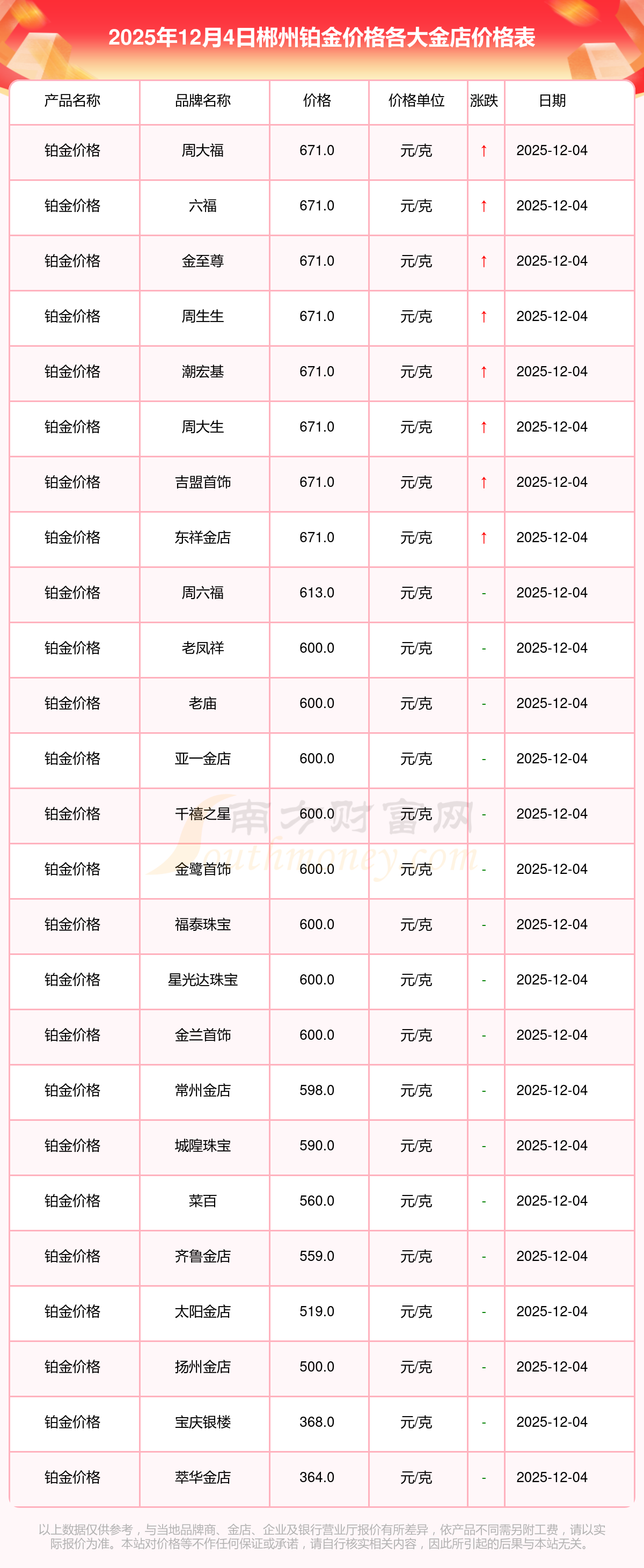 2025年12月4日郴州周大福、周大福、周大福、周大福、周大福、周大福、周大福、老鳳祥、老鳳祥、老鳳祥、六福等各大金店品牌鉑金價(jià)格最新價(jià)格行情來了,如下:周大福黃金價(jià)格1328.0元/克,周大福鉑金價(jià)格671.0元/克,周大福飾品金價(jià)(內(nèi)地)1328.0元/克,周大福黃金飾品(香港)46730.0,周大福鉑金價(jià)格(香港)19260.0,周大福金條價(jià)格(香港)42160.0,周大福金條金價(jià)(內(nèi)地)1165.0元/克,老鳳祥黃金價(jià)格1325.0元/克,老鳳祥鉑金價(jià)格600.0元/克,老鳳祥足金價(jià)格1325.0元/克,六福黃金價(jià)格1326.0元/克。