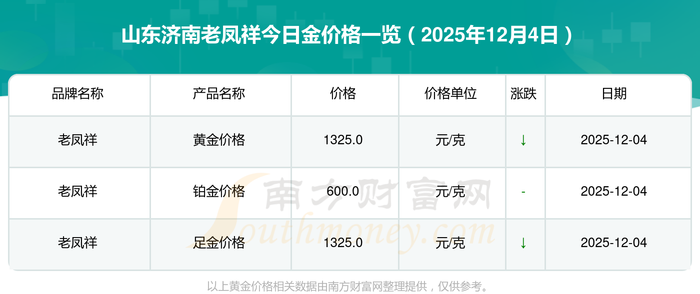 2025年12月4日山東濟(jì)南老鳳祥現(xiàn)在黃金一克要多少錢:黃金價格1328.0元/克,鉑金價格671.0元/克,飾品金價(內(nèi)地)1328.0元/克,黃金飾品(香港)46730.0,鉑金價格(香港)19260.0,金條價格(香港)42160.0,金條金價(內(nèi)地)1165.0元/克,黃金價格1325.0元/克,鉑金價格600.0元/克,足金價格1325.0元/克,黃金價格1326.0元/克。