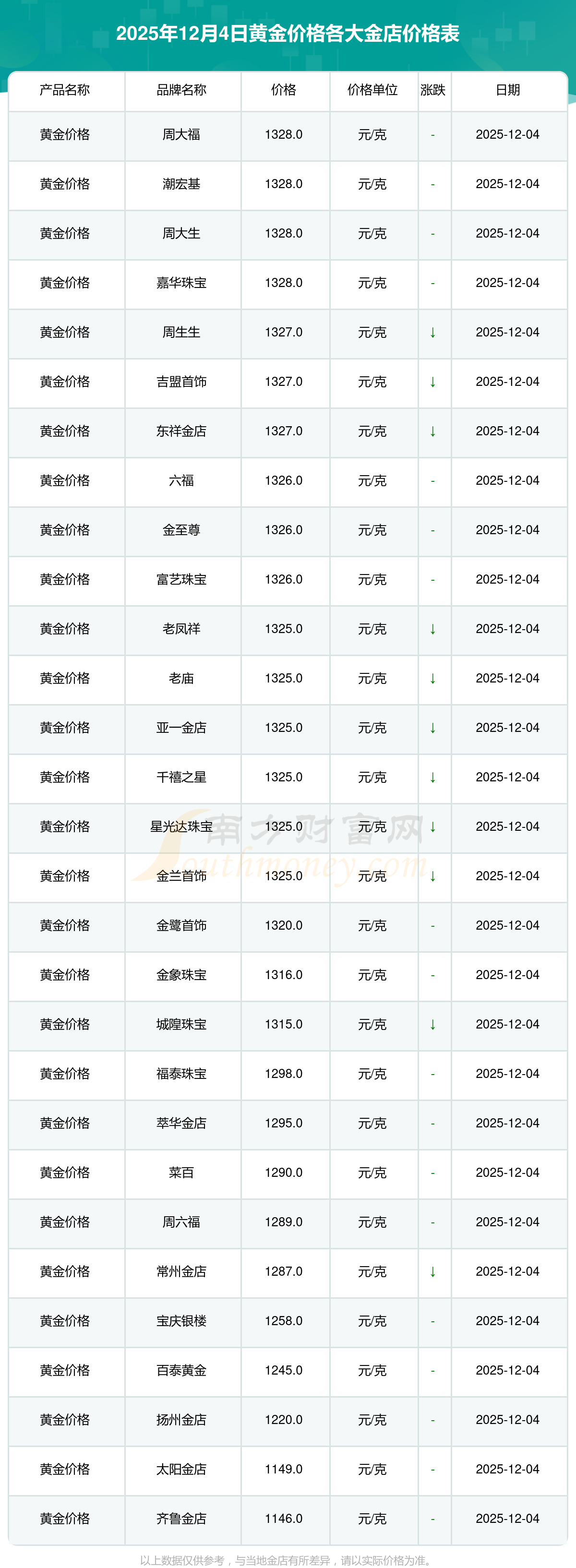 2025年12月4日,周大福、周大福、周大福、周大福、周大福、周大福、周大福、老鳳祥、老鳳祥、老鳳祥、六福等各大金店品牌黃金價格今日價格如下:周大福1328.0元/克、周大福671.0元/克、周大福1328.0元/克、周大福46730.0、周大福19260.0、周大福42160.0、周大福1165.0元/克、老鳳祥1325.0元/克、老鳳祥600.0元/克、老鳳祥1325.0元/克、六福1326.0元/克。