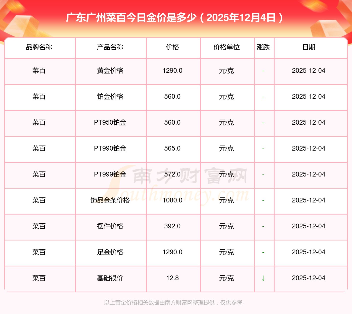 廣東廣州菜百金價(jià)今日價(jià)格最新_廣東廣州菜百黃金多少錢一克2025年12月4日,隨小編來了解一下詳情。