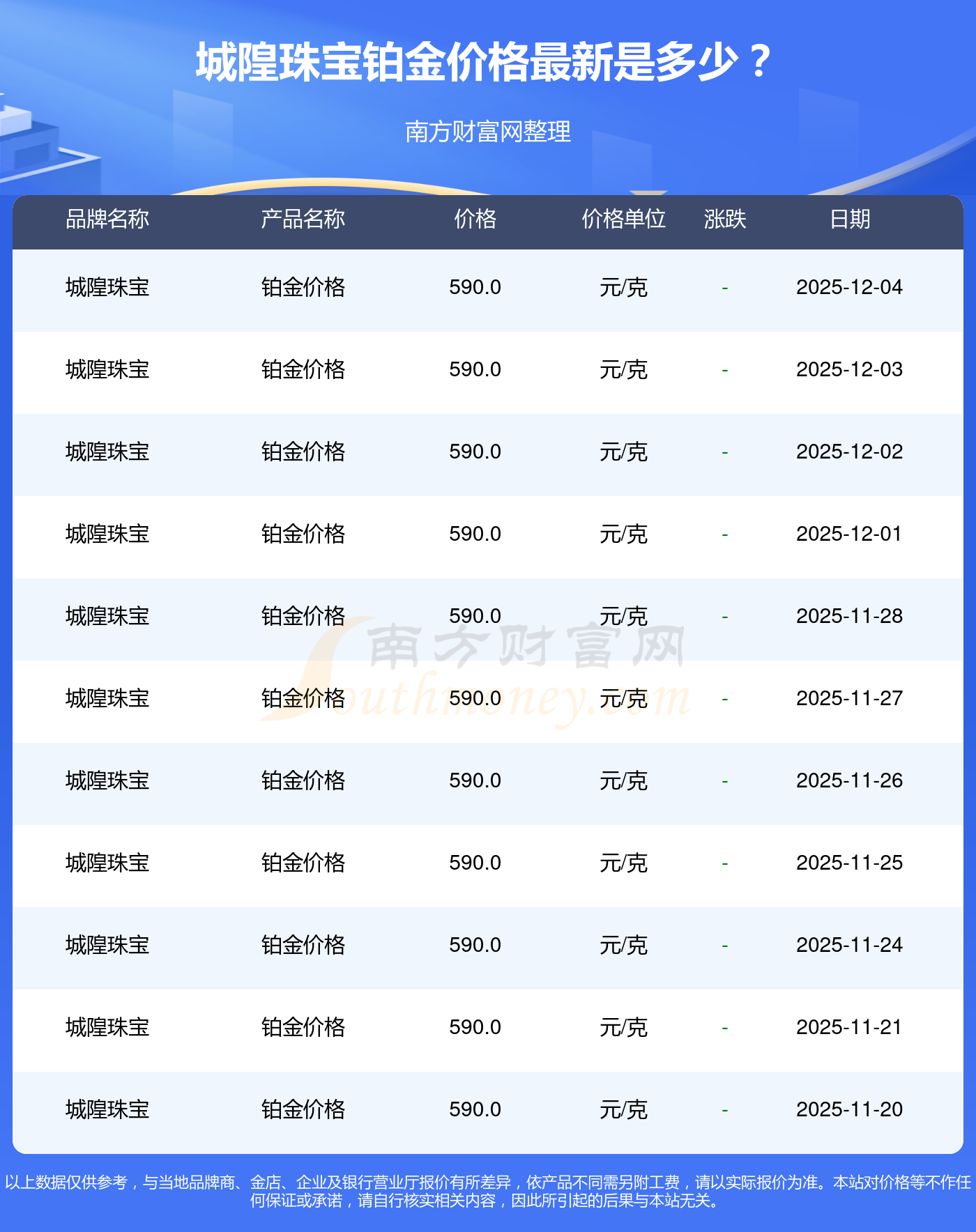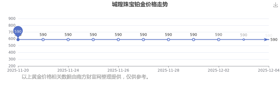 今日城隍珠寶鉑金價格最新查詢:590.0元/克。