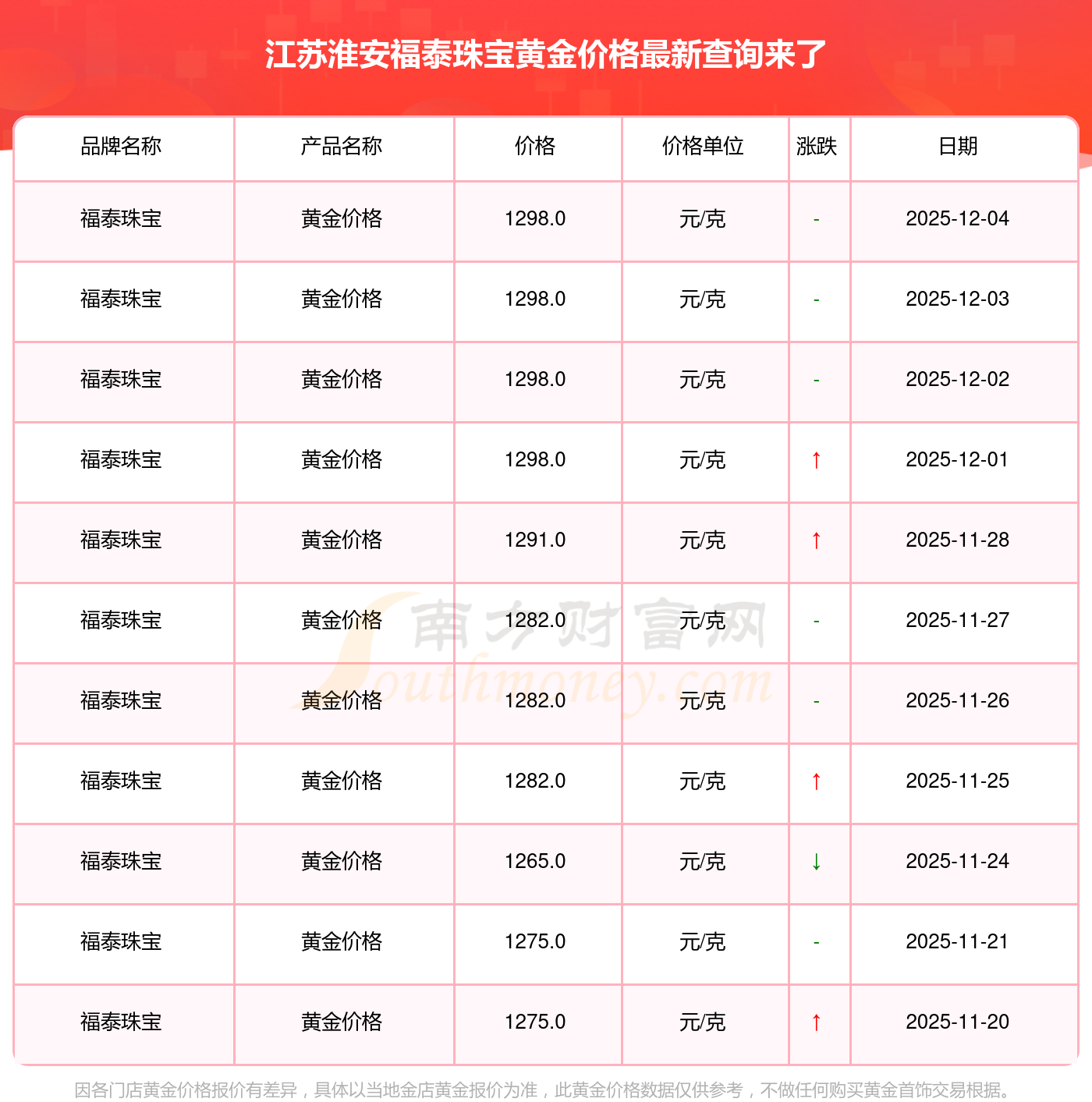 今日江蘇淮安福泰珠寶黃金價(jià)格公布想問問,今日黃金每克的定價(jià)為多少今日江蘇淮安福泰珠寶黃金價(jià)格最新價(jià)格是1298.0元/克。