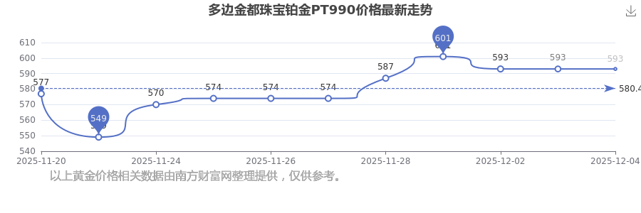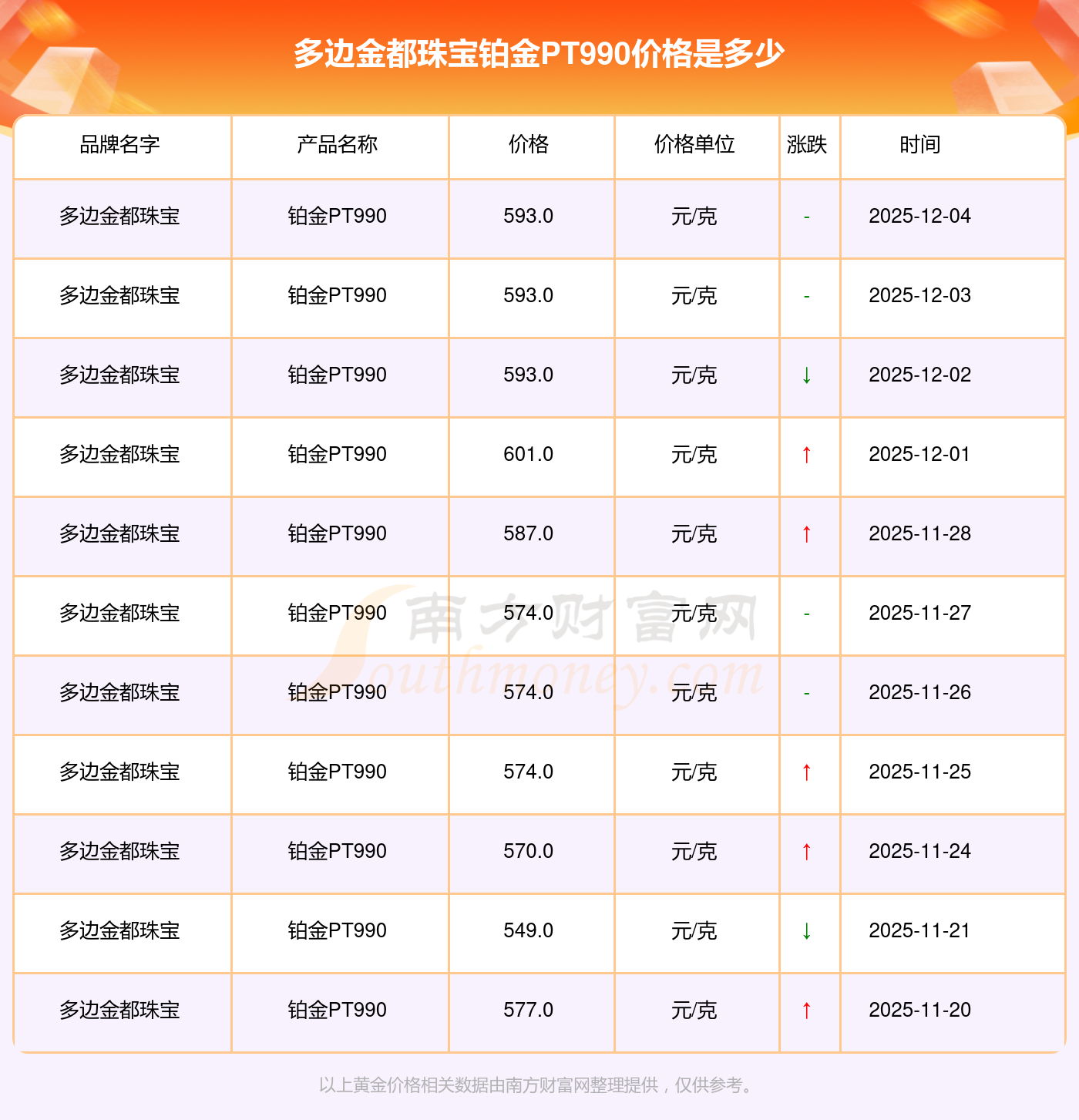 2025年12月4日多邊金都珠寶鉑金PT990價格最新是593.0元/克。