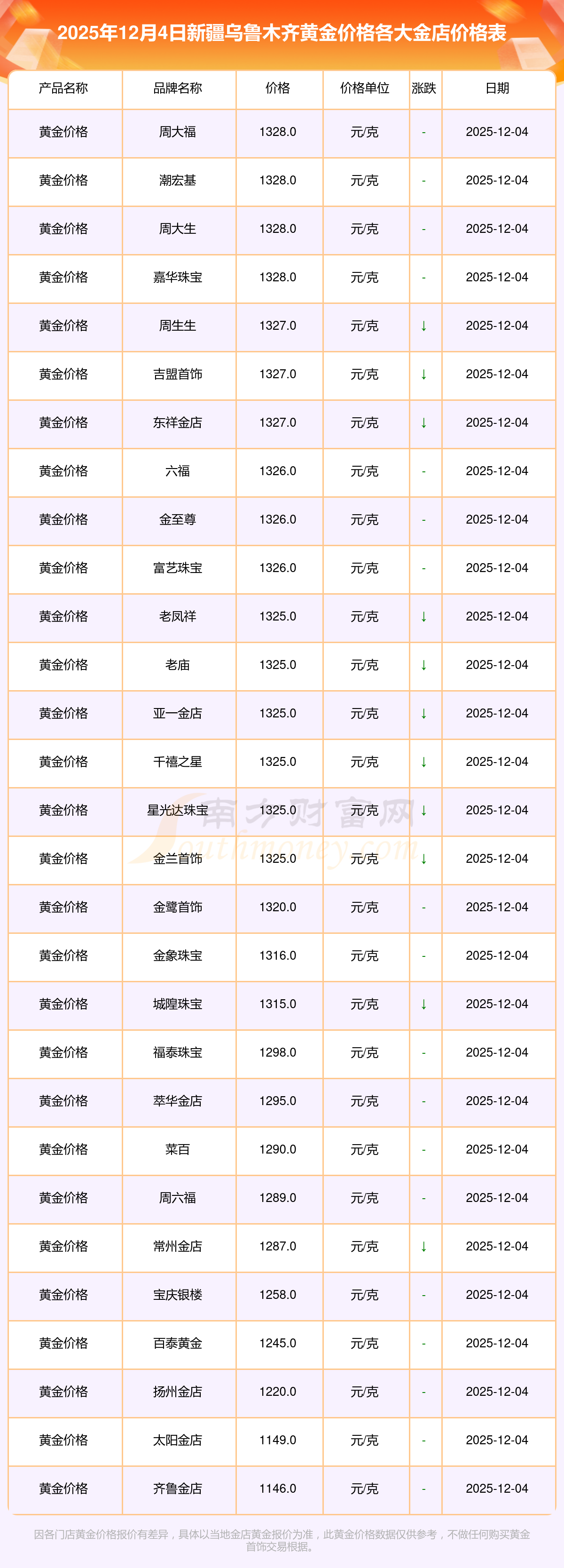 2025年12月4日新疆烏魯木齊周大福、周大福、周大福、周大福、周大福、周大福、周大福、老鳳祥、老鳳祥、老鳳祥、六福等各大金店品牌黃金價(jià)格最新價(jià)格行情來了,如下:周大福黃金價(jià)格1328.0元/克,周大福鉑金價(jià)格671.0元/克,周大福飾品金價(jià)(內(nèi)地)1328.0元/克,周大福黃金飾品(香港)46730.0,周大福鉑金價(jià)格(香港)19260.0,周大福金條價(jià)格(香港)42160.0,周大福金條金價(jià)(內(nèi)地)1165.0元/克,老鳳祥黃金價(jià)格1325.0元/克,老鳳祥鉑金價(jià)格600.0元/克,老鳳祥足金價(jià)格1325.0元/克,六福黃金價(jià)格1326.0元/克。