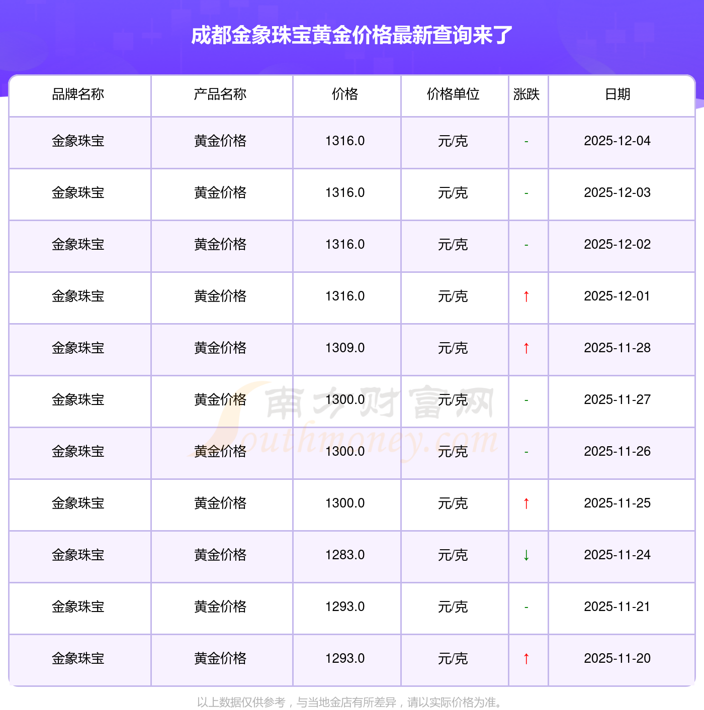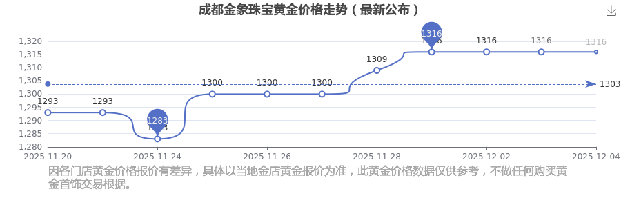 今天黃金每克的價(jià)值是多少?今日成都金象珠寶黃金價(jià)格查詢,2025年12月4日成都金象珠寶黃金價(jià)格是1316.0元/克。
