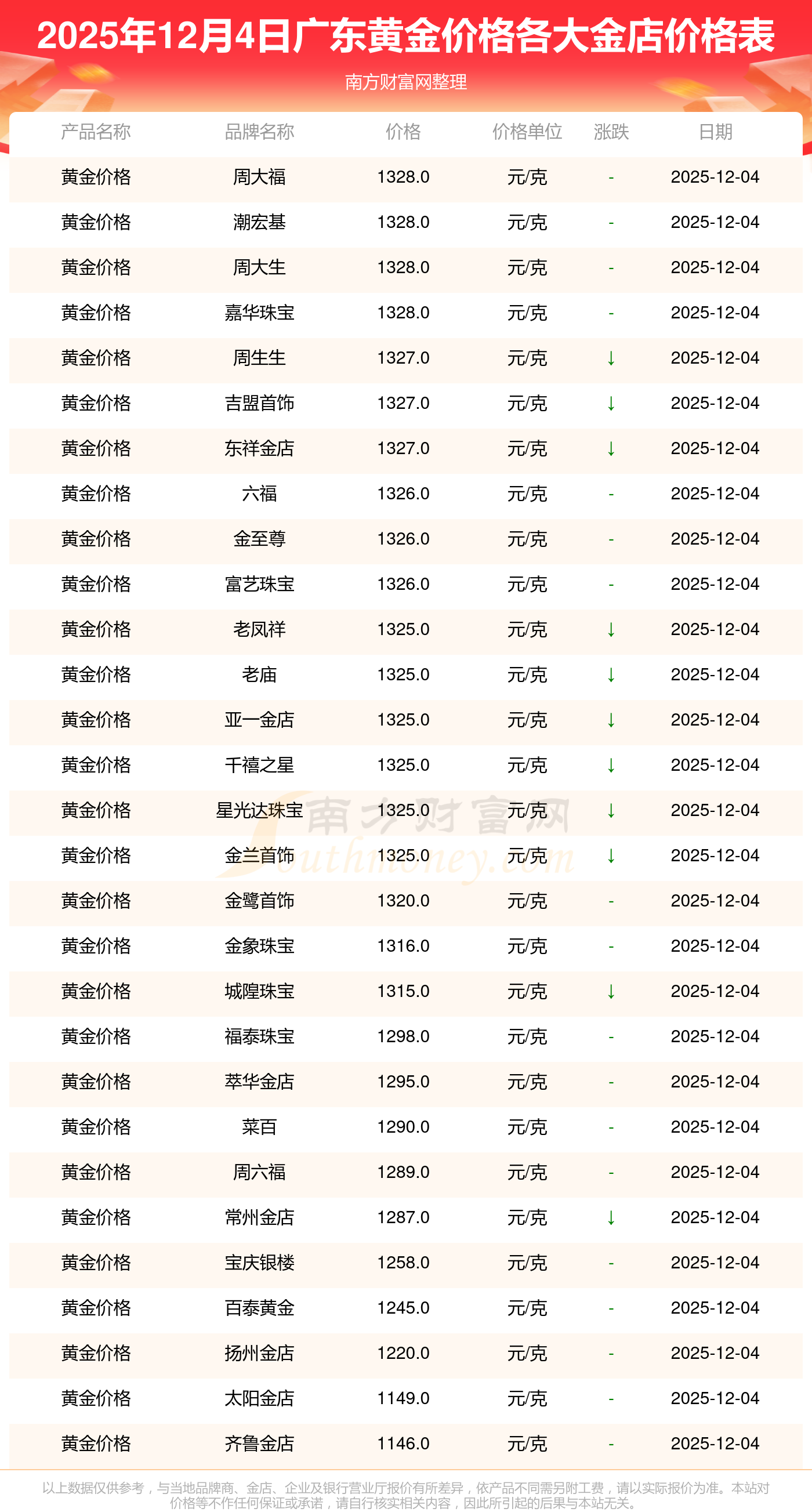 2025年12月4日廣東各大金店黃金價(jià)格最新價(jià)格查詢來了:周大福1328.0元/克,周大福671.0元/克,周大福1328.0元/克,周大福46730.0,周大福19260.0,周大福42160.0,周大福1165.0元/克,老鳳祥1325.0元/克,老鳳祥600.0元/克,老鳳祥1325.0元/克,六福1326.0元/克。