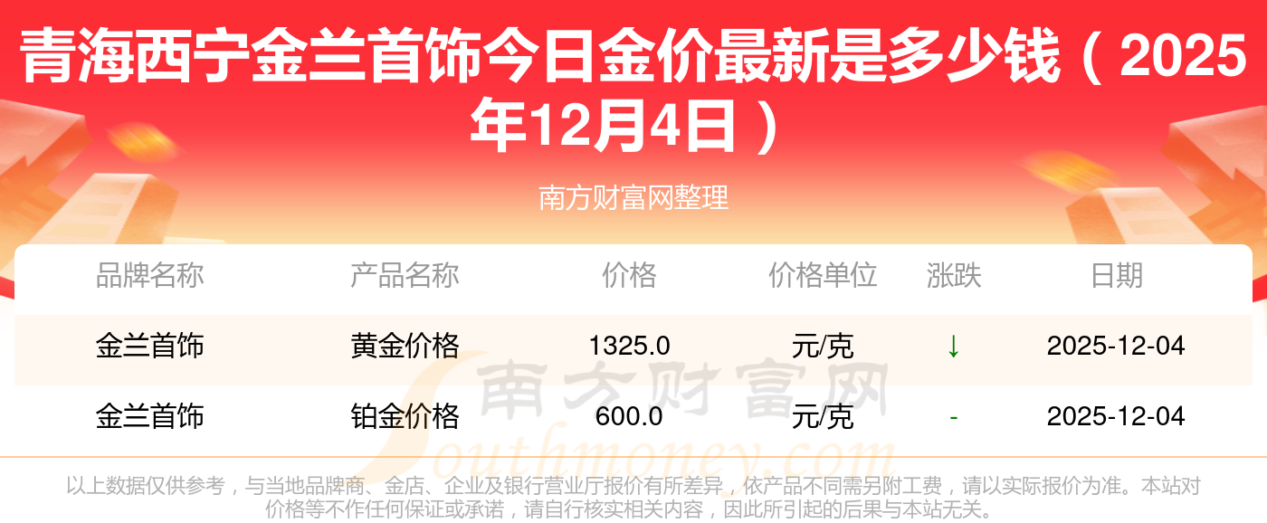 2025年12月4日青海西寧金蘭首飾每克黃金的市場價格是多少:黃金價格1328.0元/克,鉑金價格671.0元/克,飾品金價(內(nèi)地)1328.0元/克,黃金飾品(香港)46730.0,鉑金價格(香港)19260.0,金條價格(香港)42160.0,金條金價(內(nèi)地)1165.0元/克,黃金價格1325.0元/克,鉑金價格600.0元/克,足金價格1325.0元/克,黃金價格1326.0元/克。