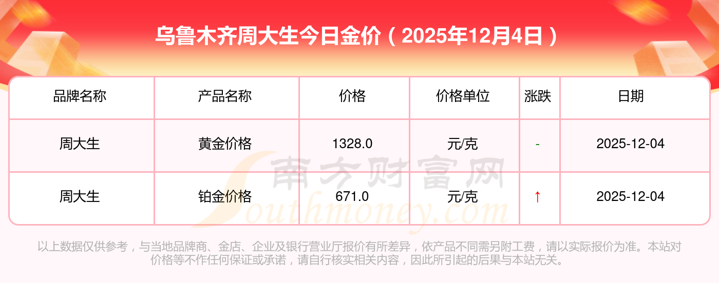 想了解今日黃金價(jià)格,現(xiàn)在每克黃金的價(jià)格是多少呢?2025年12月4日烏魯木齊周大生金價(jià)查詢:黃金價(jià)格1328.0元/克,鉑金價(jià)格671.0元/克,飾品金價(jià)(內(nèi)地)1328.0元/克,黃金飾品(香港)46730.0,鉑金價(jià)格(香港)19260.0,金條價(jià)格(香港)42160.0,金條金價(jià)(內(nèi)地)1165.0元/克,黃金價(jià)格1325.0元/克,鉑金價(jià)格600.0元/克,足金價(jià)格1325.0元/克,黃金價(jià)格1326.0元/克。