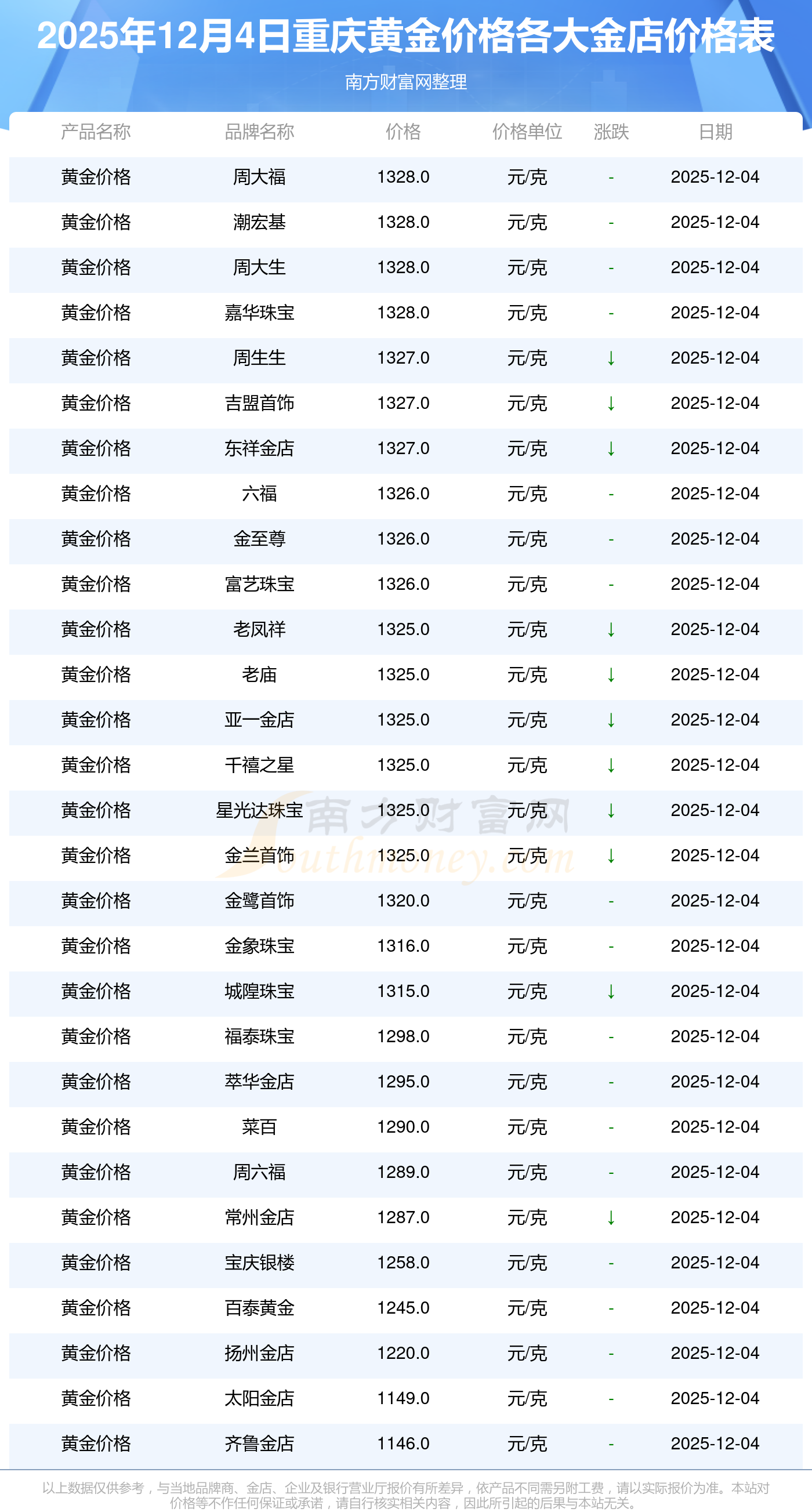 今天是2025年12月4日,重慶周大福、周大福、周大福、周大福、周大福、周大福、周大福、老鳳祥、老鳳祥、老鳳祥、六福等各大金店品牌黃金價格最新價格行情是這樣的:周大福1328.0元/克、周大福671.0元/克、周大福1328.0元/克、周大福46730.0、周大福19260.0、周大福42160.0、周大福1165.0元/克、老鳳祥1325.0元/克、老鳳祥600.0元/克、老鳳祥1325.0元/克、六福1326.0元/克。