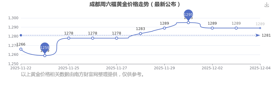 成都周六福的黃金價格在今日(2025年12月4日),每克售價為1289.0元/克。