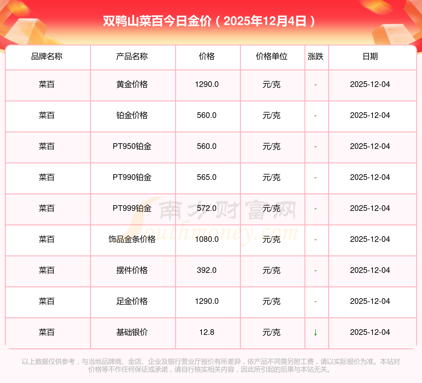 黃金價格1328.0元/克,鉑金價格671.0元/克,飾品金價(內(nèi)地)1328.0元/克,黃金飾品(香港)46730.0,鉑金價格(香港)19260.0,金條價格(香港)42160.0,金條金價(內(nèi)地)1165.0元/克,黃金價格1325.0元/克,鉑金價格600.0元/克,足金價格1325.0元/克,黃金價格1326.0元/克。