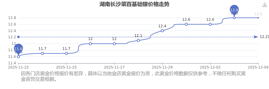 今日(2025年12月4日),湖南長沙菜百基礎(chǔ)銀價(jià)格:12.8元/克。