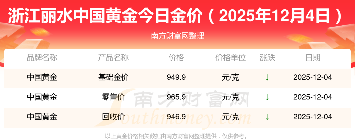 2025年12月4日浙江麗水中國(guó)黃金最新價(jià)格:黃金價(jià)格1328.0元/克,鉑金價(jià)格671.0元/克,飾品金價(jià)(內(nèi)地)1328.0元/克,黃金飾品(香港)46730.0,鉑金價(jià)格(香港)19260.0,金條價(jià)格(香港)42160.0,金條金價(jià)(內(nèi)地)1165.0元/克,黃金價(jià)格1325.0元/克,鉑金價(jià)格600.0元/克,足金價(jià)格1325.0元/克,黃金價(jià)格1326.0元/克。