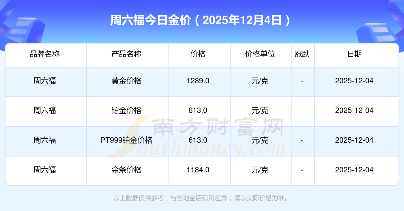 2025年12月4日各大金店金條價(jià)格最新價(jià)格:周大福1328.0元/克,周大福671.0元/克,周大福1328.0元/克,周大福46730.0,周大福19260.0,周大福42160.0,周大福1165.0元/克,老鳳祥1325.0元/克,老鳳祥600.0元/克,老鳳祥1325.0元/克,六福1326.0元/克。