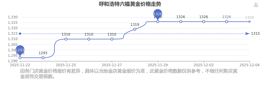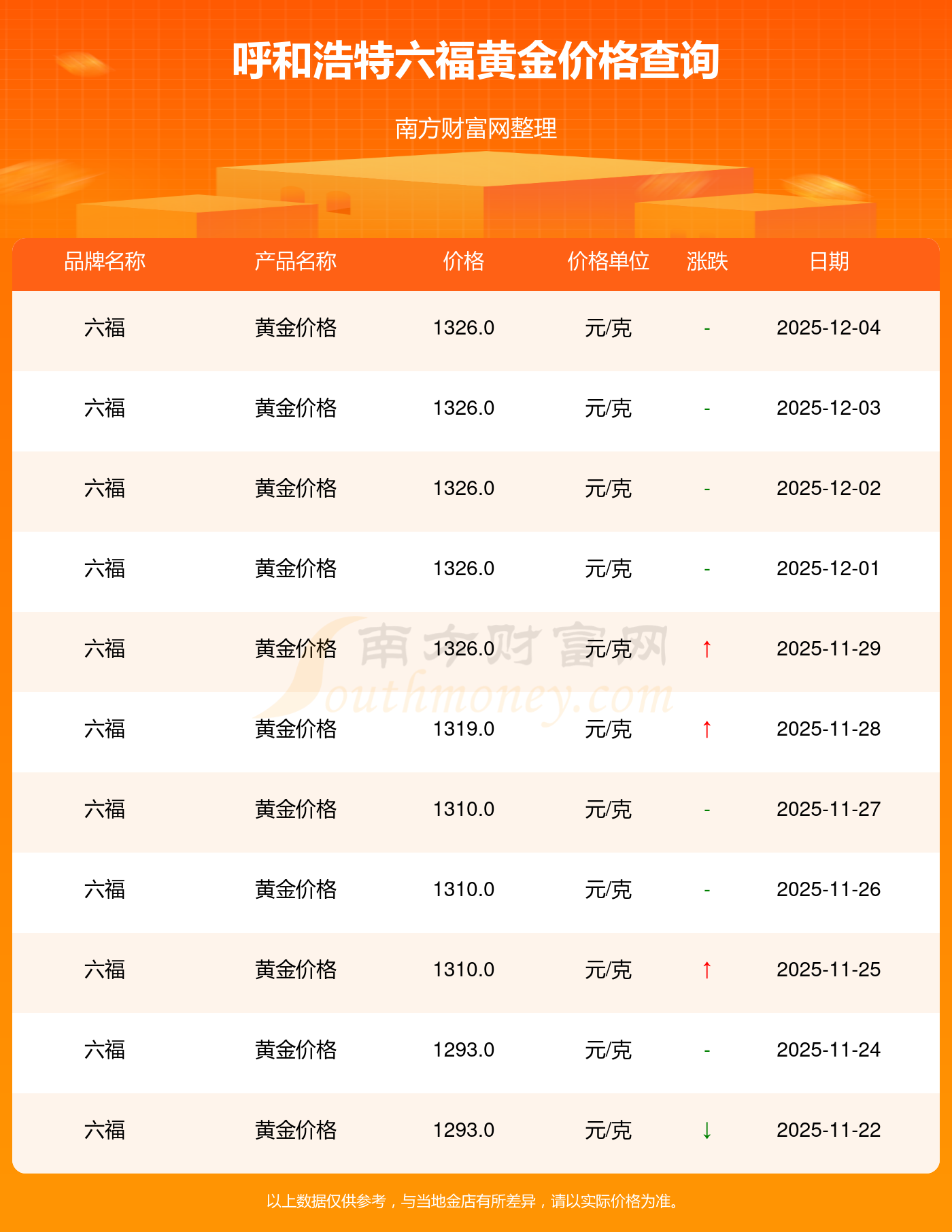 呼和浩特六福黃金價(jià)格在 2025年12月4日,其市場(chǎng)價(jià)格為 1326.0元/克。