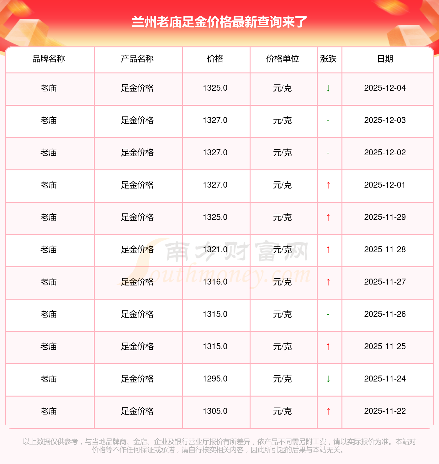 蘭州老廟在 2025年12月4日,足金價格的售賣價格是 1325.0元/克。
