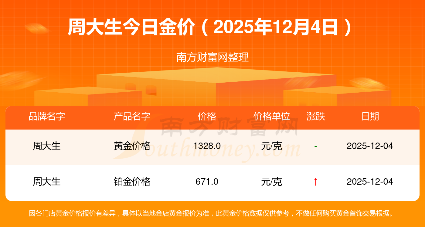 2025年12月4日周大生最新價(jià)格:黃金價(jià)格1328.0元/克,鉑金價(jià)格671.0元/克,飾品金價(jià)(內(nèi)地)1328.0元/克,黃金飾品(香港)46730.0,鉑金價(jià)格(香港)19260.0,金條價(jià)格(香港)42160.0,金條金價(jià)(內(nèi)地)1165.0元/克,黃金價(jià)格1325.0元/克,鉑金價(jià)格600.0元/克,足金價(jià)格1325.0元/克,黃金價(jià)格1326.0元/克。