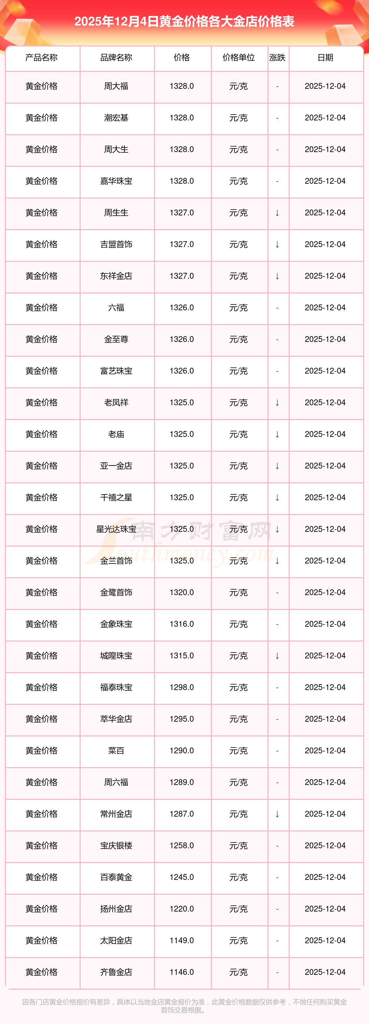 2025年12月4日,周大福、周大福、周大福、周大福、周大福、周大福、周大福、老鳳祥、老鳳祥、老鳳祥、六福等各大金店品牌黃金價(jià)格今日價(jià)格如下:周大福1328.0元/克、周大福671.0元/克、周大福1328.0元/克、周大福46730.0、周大福19260.0、周大福42160.0、周大福1165.0元/克、老鳳祥1325.0元/克、老鳳祥600.0元/克、老鳳祥1325.0元/克、六福1326.0元/克。
