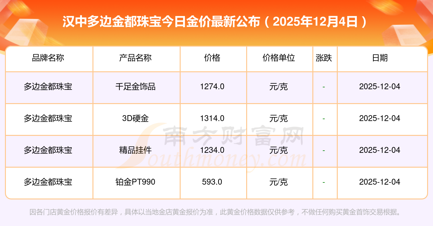 漢中最新多邊金都珠寶今日金價多少錢一克?(2025年12月4日)