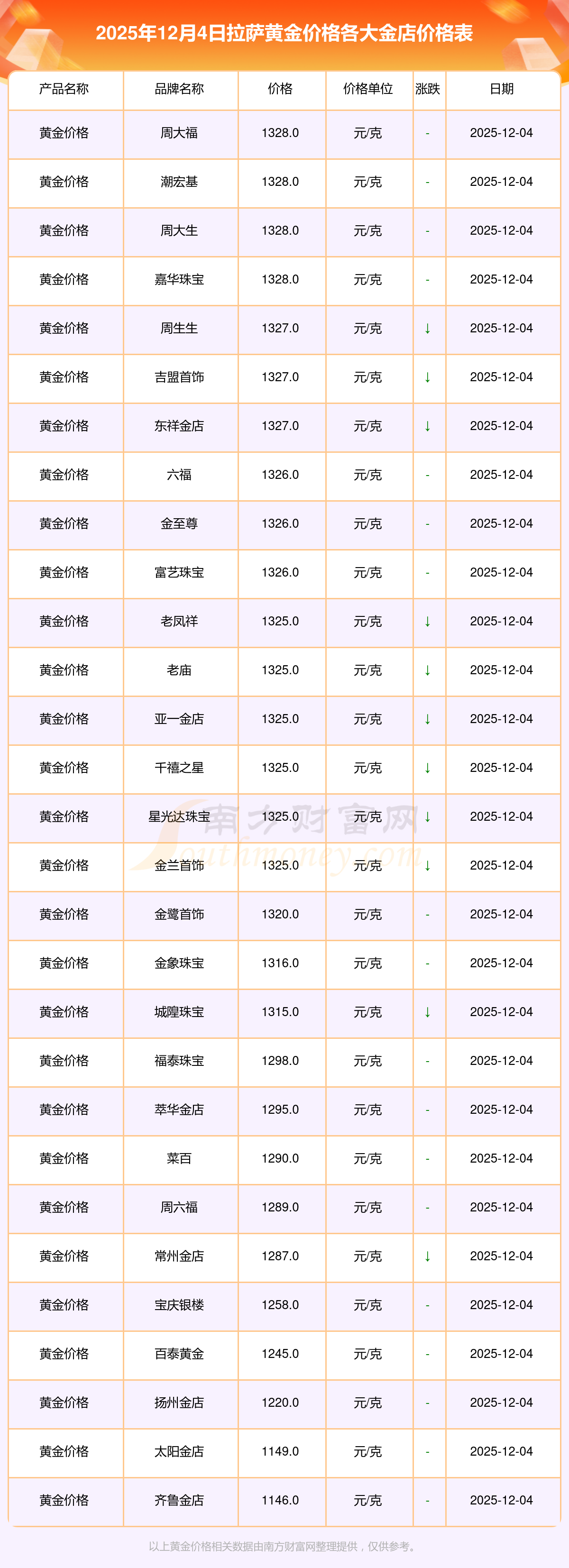 2025年12月4日,拉薩周大福、周大福、周大福、周大福、周大福、周大福、周大福、老鳳祥、老鳳祥、老鳳祥、六福等各大金店品牌黃金價(jià)格今日價(jià)格行情最新來(lái)了:周大福1328.0元/克、周大福671.0元/克、周大福1328.0元/克、周大福46730.0、周大福19260.0、周大福42160.0、周大福1165.0元/克、老鳳祥1325.0元/克、老鳳祥600.0元/克、老鳳祥1325.0元/克、六福1326.0元/克。