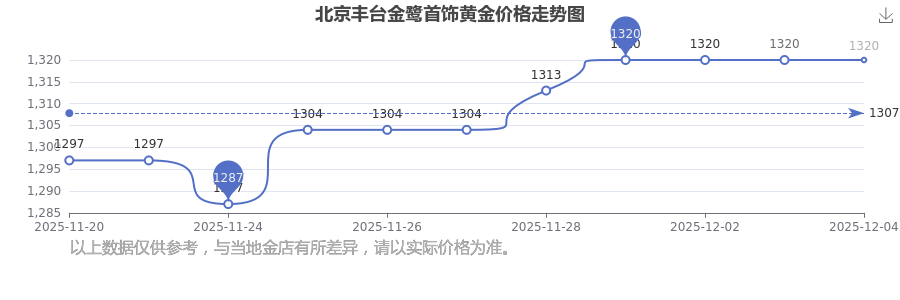 北京豐臺金鷺首飾黃金價格在 2025年12月4日為 1320.0元/克。