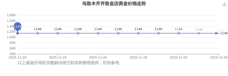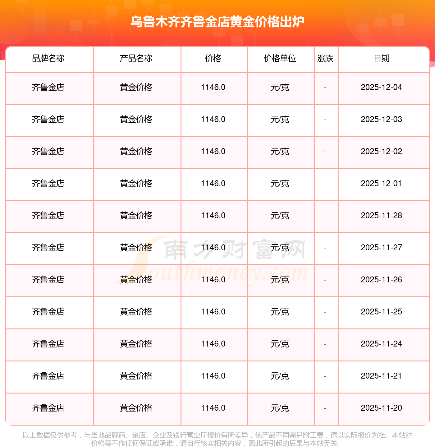 烏魯木齊齊魯金店在 2025年12月4日的黃金價格零售價格為 1146.0元/克。