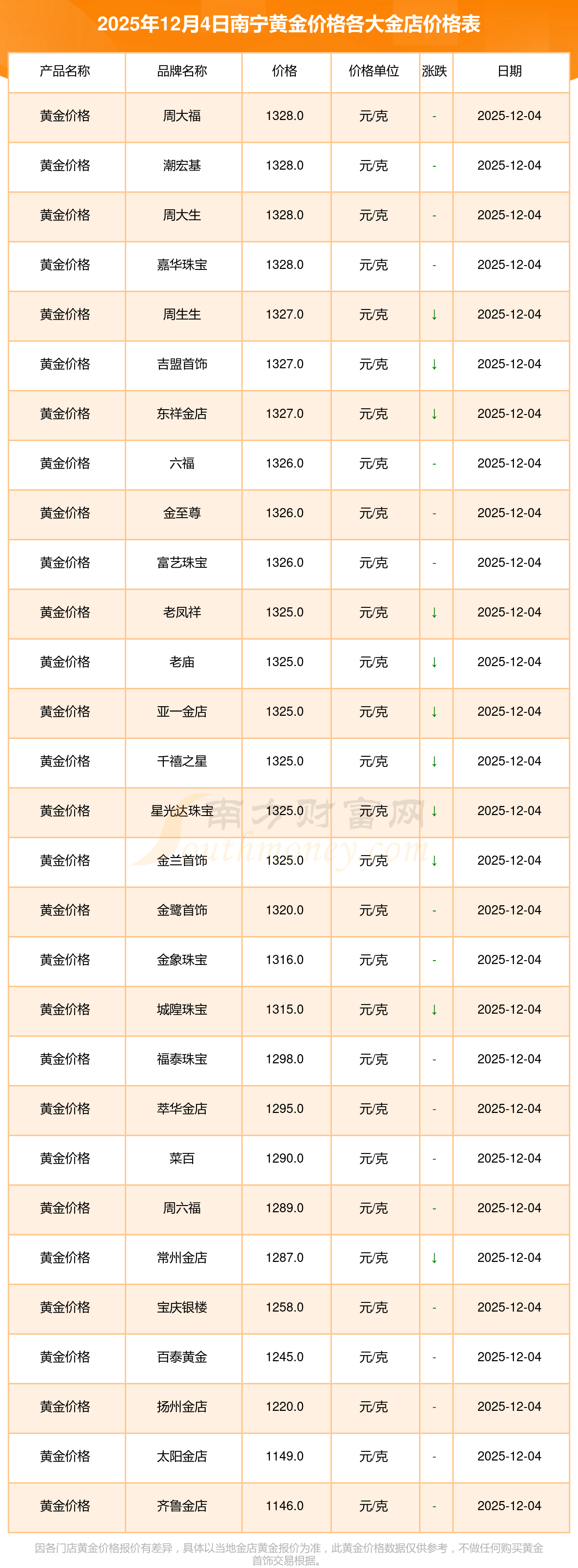 2025年12月4日南寧各大金店黃金價格最新價格查詢來了:周大福1328.0元/克,周大福671.0元/克,周大福1328.0元/克,周大福46730.0,周大福19260.0,周大福42160.0,周大福1165.0元/克,老鳳祥1325.0元/克,老鳳祥600.0元/克,老鳳祥1325.0元/克,六福1326.0元/克。