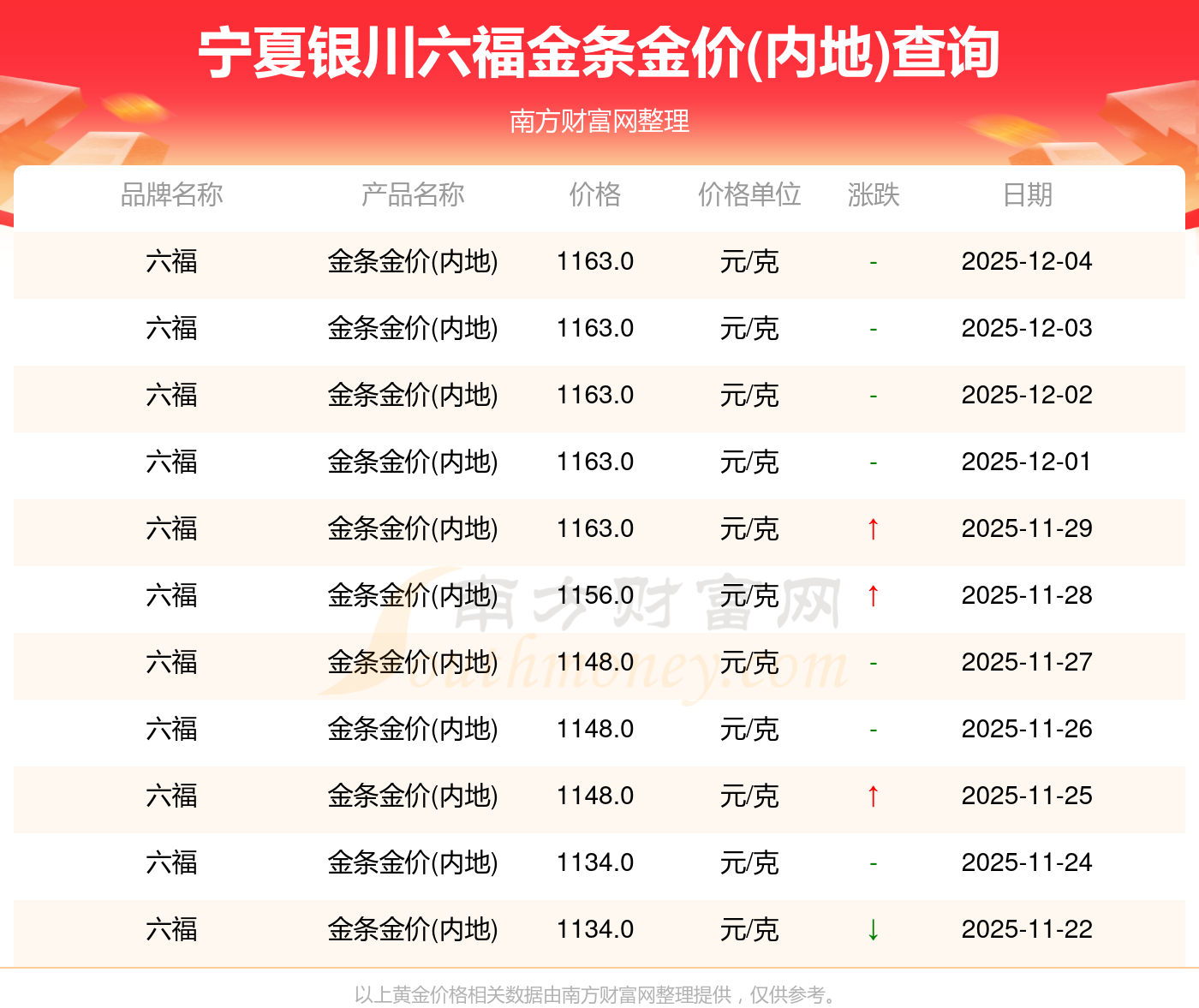 今日寧夏銀川六福金條金價(內(nèi)地)最新查詢,2025年12月4日六福金條金價(內(nèi)地)是多少錢一克?隨小編來了解一下詳情。