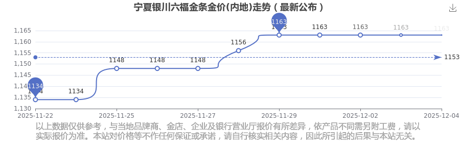 今日寧夏銀川六福金條金價(內(nèi)地)最新為:1163.0元/克。