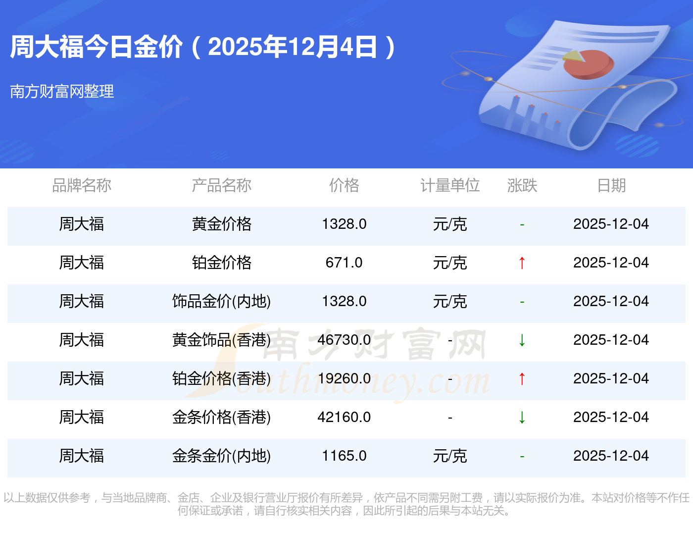 周大福黃金在今日的定價(jià)為多少?黃金價(jià)格1328.0元/克,鉑金價(jià)格671.0元/克,飾品金價(jià)(內(nèi)地)1328.0元/克,黃金飾品(香港)46730.0,鉑金價(jià)格(香港)19260.0,金條價(jià)格(香港)42160.0,金條金價(jià)(內(nèi)地)1165.0元/克,黃金價(jià)格1325.0元/克,鉑金價(jià)格600.0元/克,足金價(jià)格1325.0元/克,黃金價(jià)格1326.0元/克。