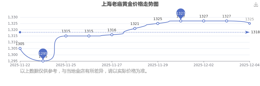 2025年12月4日上海老廟黃金價格為1325.0元/克。