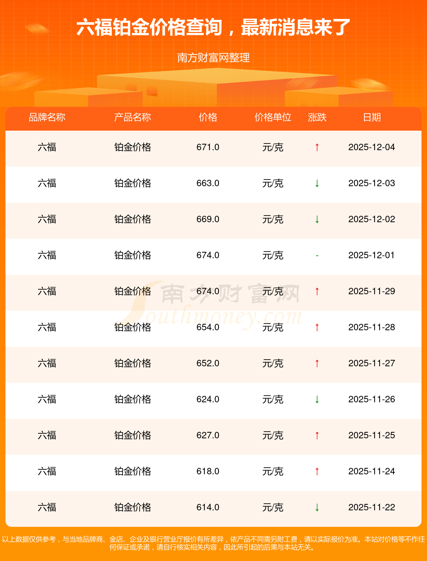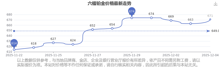 今日六福 鉑金價格的最新定價為671.0元/克。
