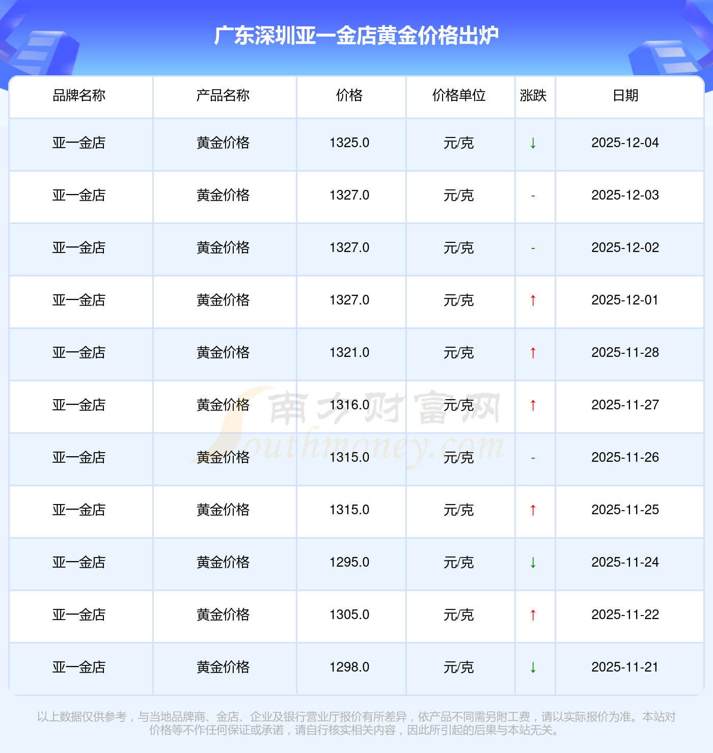 于 2025年12月4日,廣東深圳亞一金店黃金價(jià)格的克價(jià)為1325.0元/克。