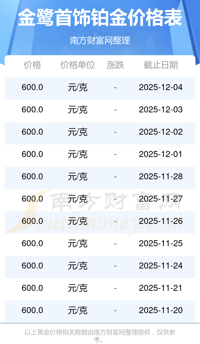 據(jù)了解,金鷺首飾今日鉑金價(jià)格為600.0元/克。