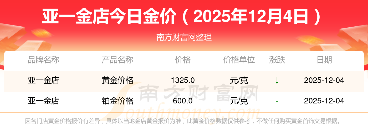 現(xiàn)在亞一金店黃金價(jià)格是多少錢(qián)1克_2025年亞一金店今日金價(jià)是多少錢(qián)一克,最新亞一金店查詢(xún),2025年12月4日亞一金店鉑金價(jià)格現(xiàn)在每克多少錢(qián)?最新亞一金店鉑金價(jià)格報(bào)價(jià)公布,一起來(lái)看看吧!