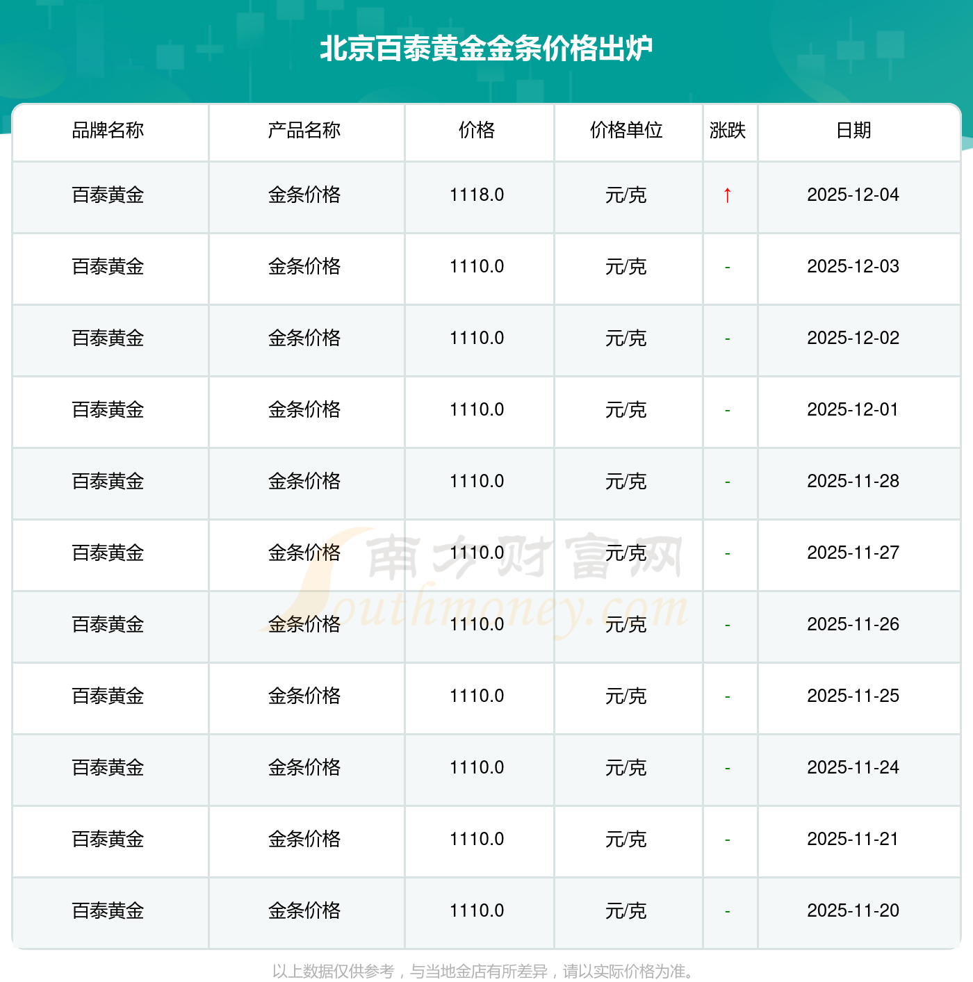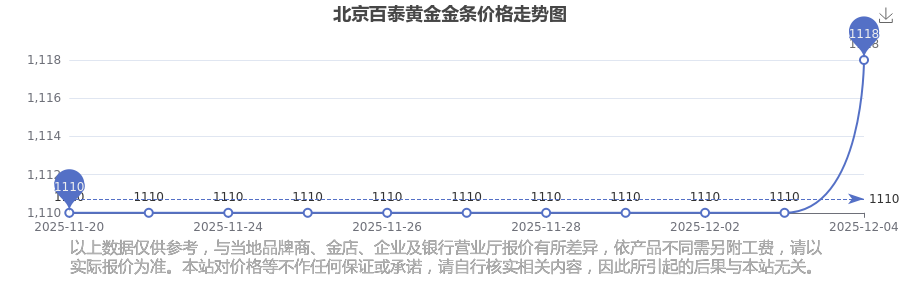 (2025年12月4日)北京百泰黃金金條價(jià)格現(xiàn)在為1118.0元/克。