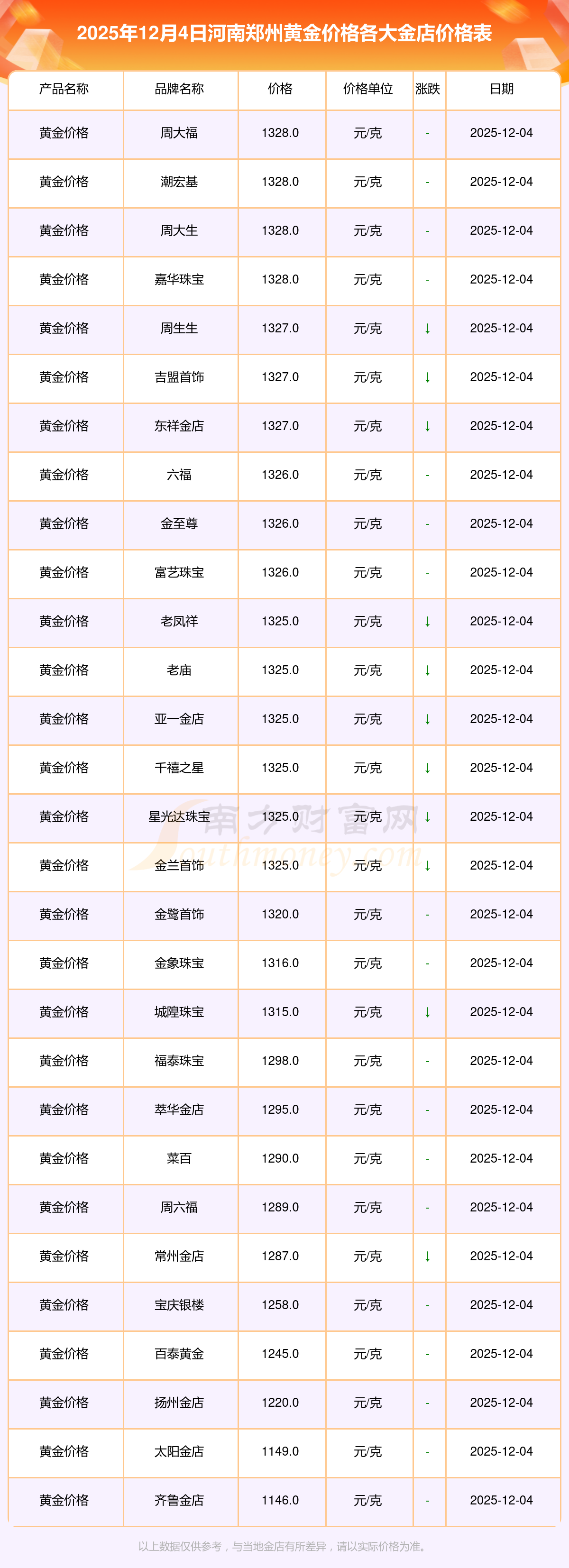 今天是2025年12月4日,河南鄭州周大福、周大福、周大福、周大福、周大福、周大福、周大福、老鳳祥、老鳳祥、老鳳祥、六福等各大金店品牌黃金價格最新價格如下:周大福1328.0元/克、周大福671.0元/克、周大福1328.0元/克、周大福46730.0、周大福19260.0、周大福42160.0、周大福1165.0元/克、老鳳祥1325.0元/克、老鳳祥600.0元/克、老鳳祥1325.0元/克、六福1326.0元/克。