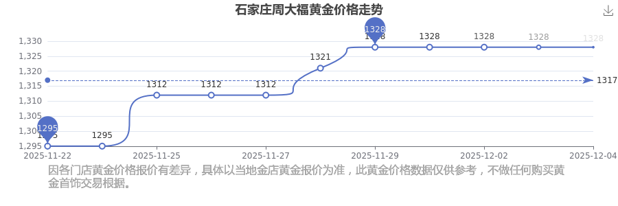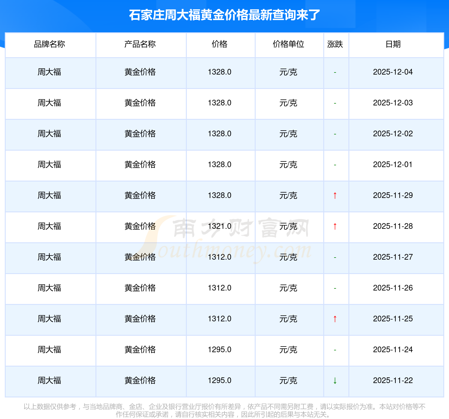 (2025年12月4日)石家莊周大福黃金價格現(xiàn)在為1328.0元/克。