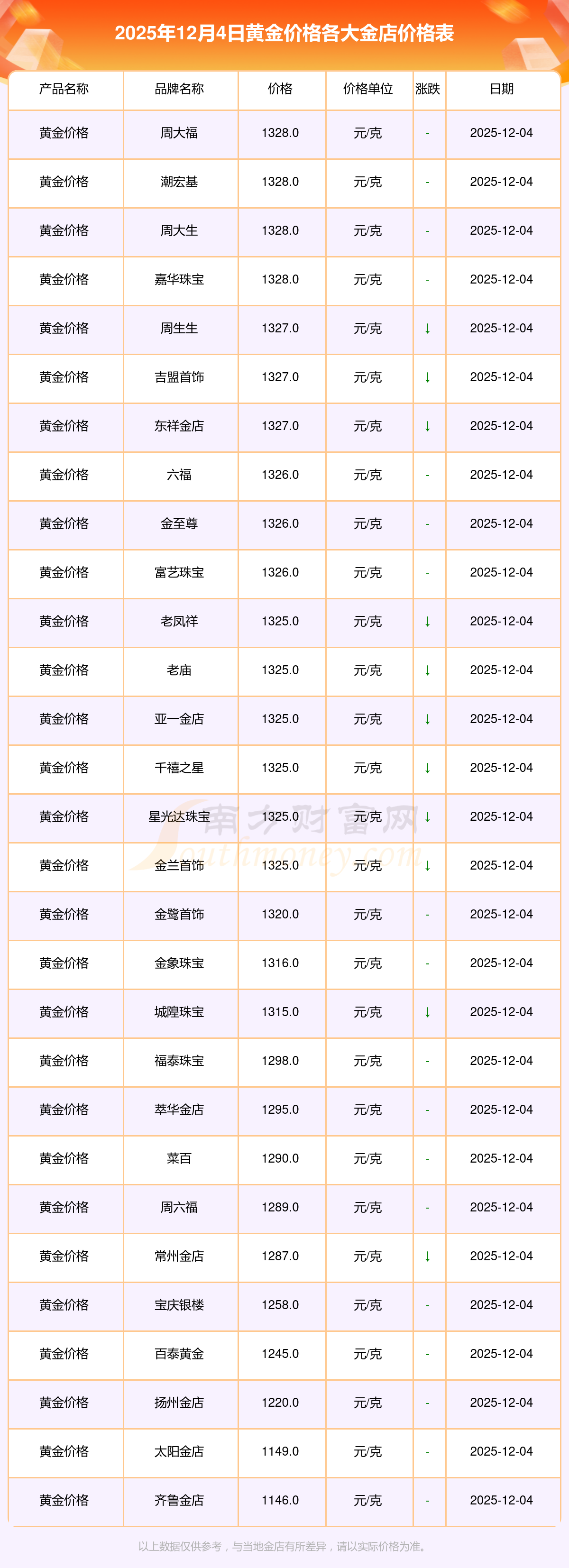 2025年12月4日各大金店黃金價格最新價格:周大福1328.0元/克,周大福671.0元/克,周大福1328.0元/克,周大福46730.0,周大福19260.0,周大福42160.0,周大福1165.0元/克,老鳳祥1325.0元/克,老鳳祥600.0元/克,老鳳祥1325.0元/克,六福1326.0元/克。