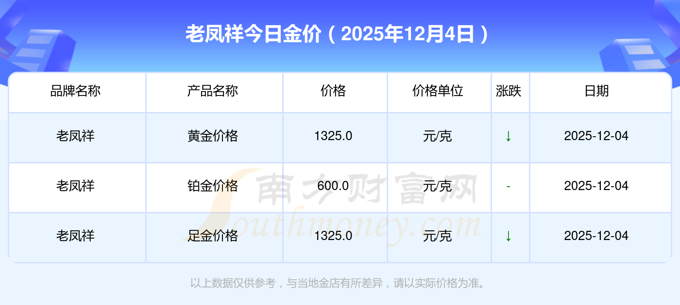 今天是2025年12月4日,周大福、周大福、周大福、周大福、周大福、周大福、周大福、老鳳祥、老鳳祥、老鳳祥、六福等各大金店品牌鉑金價格最新價格如下:周大福1328.0元/克、周大福671.0元/克、周大福1328.0元/克、周大福46730.0、周大福19260.0、周大福42160.0、周大福1165.0元/克、老鳳祥1325.0元/克、老鳳祥600.0元/克、老鳳祥1325.0元/克、六福1326.0元/克。