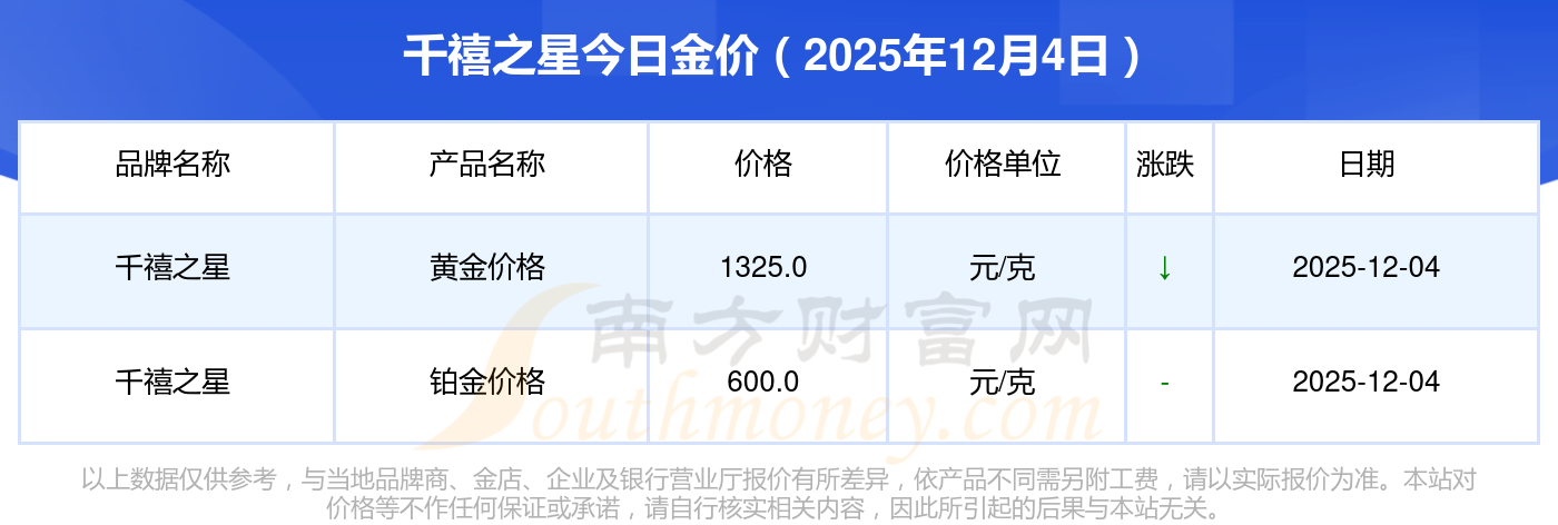 因各門店黃金價格報價有差異,具體以當?shù)亟鸬挈S金報價為準,此黃金價格數(shù)據(jù)僅供參考,不做任何購買黃金首飾交易根據(jù)。