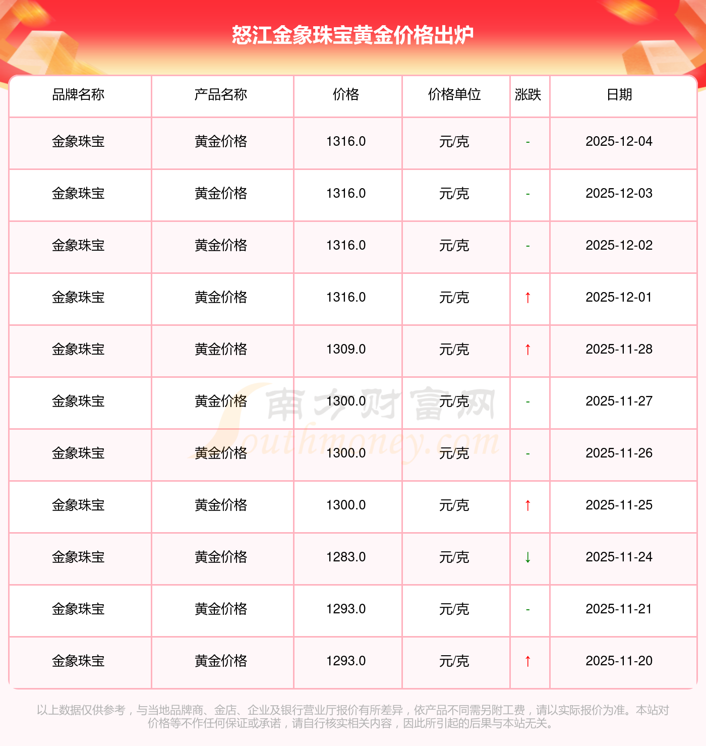 今日(2025年12月4日)怒江金象珠寶黃金價(jià)格為1316.0元/克。