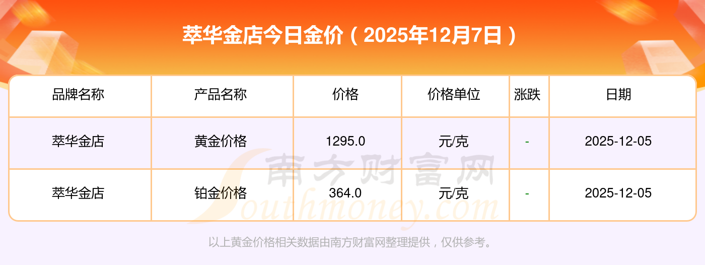 2025年12月7日萃華金店最新價格:黃金價格1328.0元/克,鉑金價格662.0元/克,飾品金價(內(nèi)地)1328.0元/克,黃金飾品(香港)46550.0,鉑金價格(香港)18970.0,金條價格(香港)41990.0,金條金價(內(nèi)地)1165.0元/克,黃金價格1325.0元/克,鉑金價格600.0元/克,足金價格1325.0元/克,黃金價格1289.0元/克。