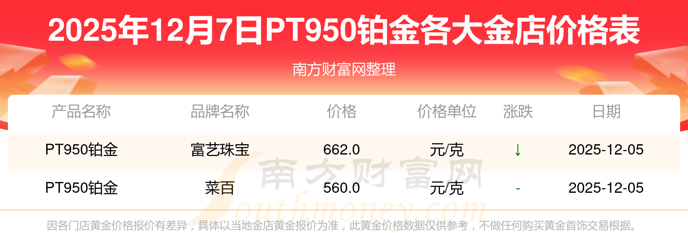 2025年12月7日各金店PT950鉑金價格查詢_今日PT950鉑金價格最新參考來了,隨小編來看看。
