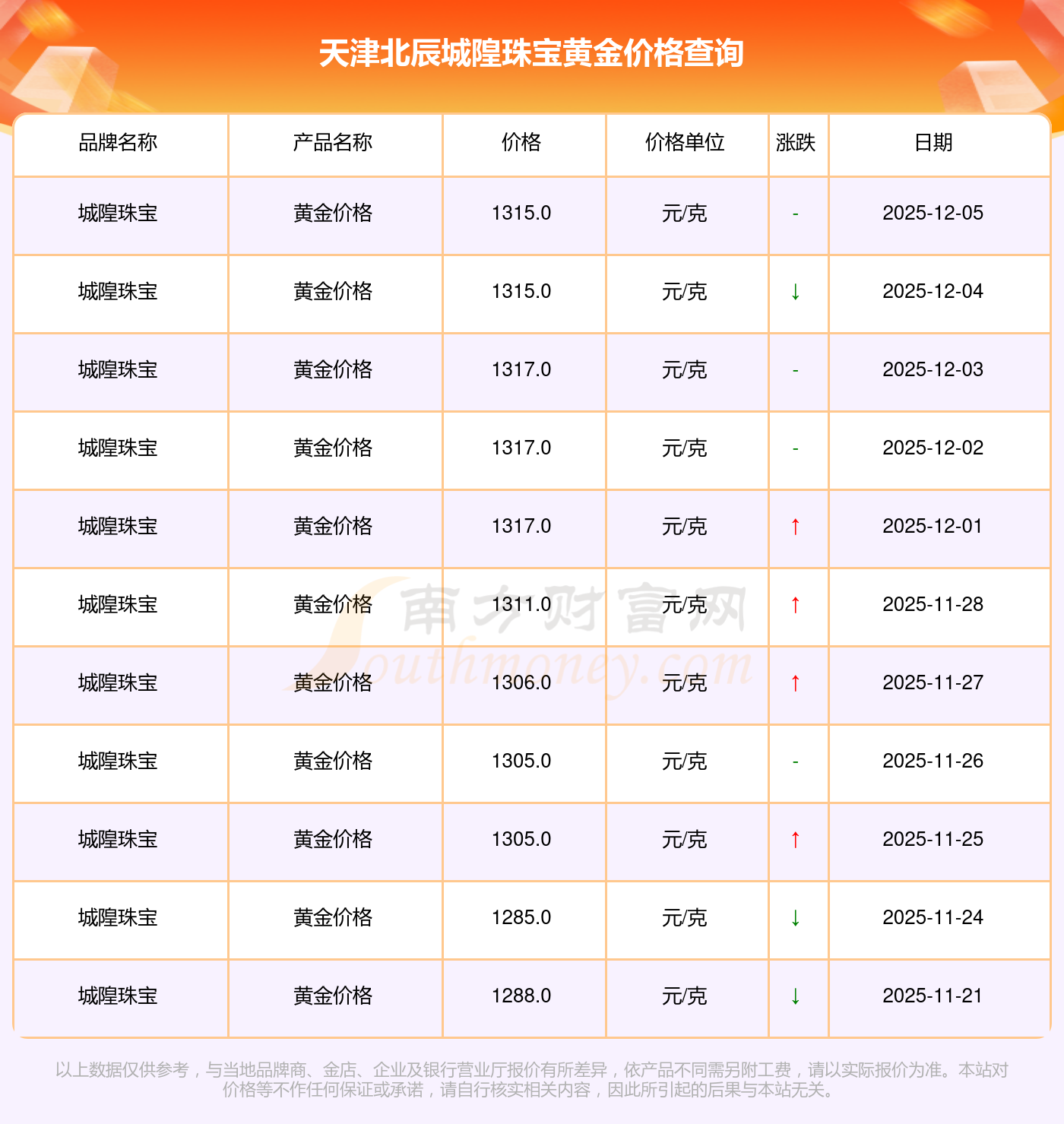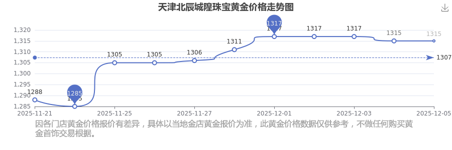 今日(2025年12月7日)天津北辰城隍珠寶黃金價(jià)格是1315.0元/克。
