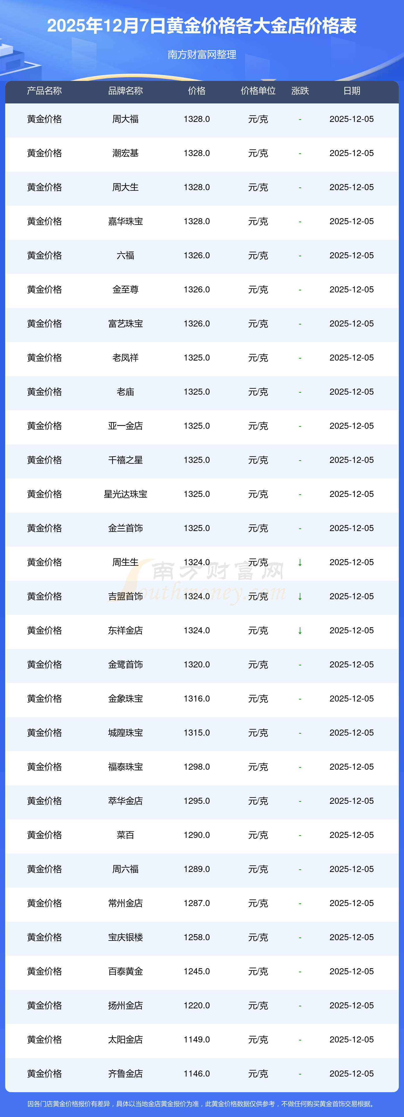 2025年12月7日各大金店黃金價格最新價格:周大福1328.0元/克,周大福662.0元/克,周大福1328.0元/克,周大福46550.0,周大福18970.0,周大福41990.0,周大福1165.0元/克,老鳳祥1325.0元/克,老鳳祥600.0元/克,老鳳祥1325.0元/克,周六福1289.0元/克。