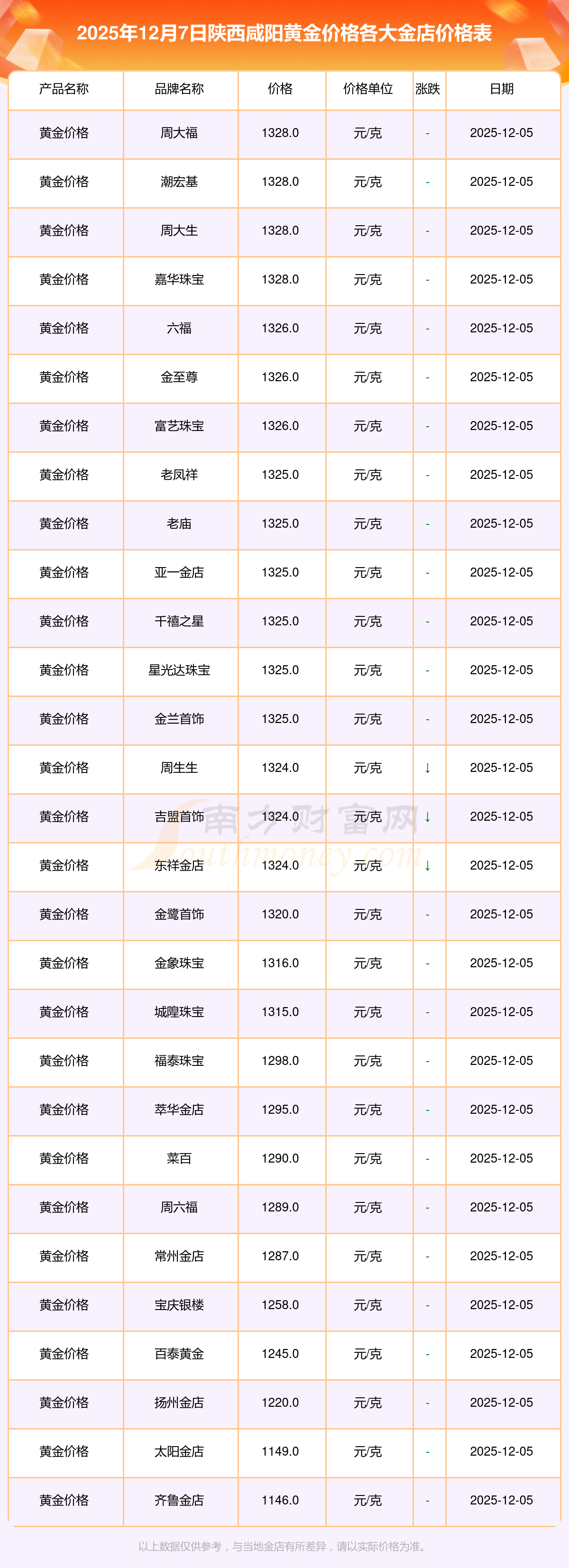 陜西咸陽各金店黃金價(jià)格表公布(2025年12月7日)