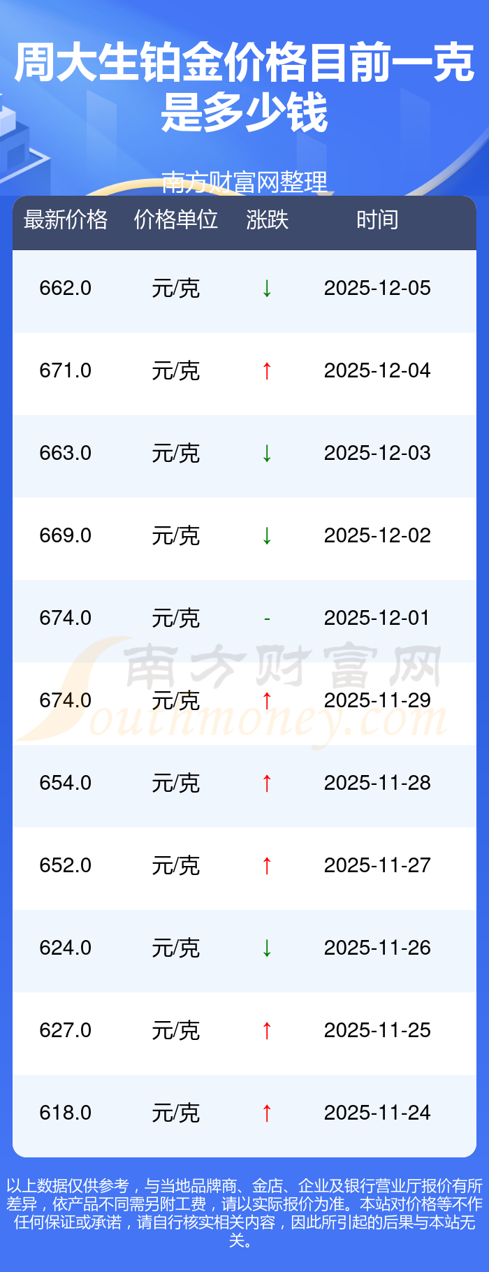 2025年12月7日周大生鉑金價(jià)格:662.0元/克。